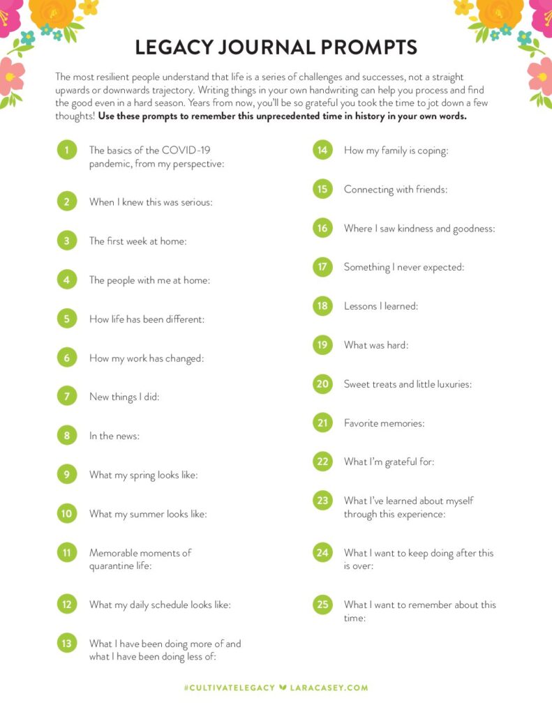 3. Choose what you’ll write. To help make it simple for you, we made a free, downloadable list of pandemic journal prompts. No more hesitation over what to write, whether you consider yourself a “writer” or not—just follow our prompts!